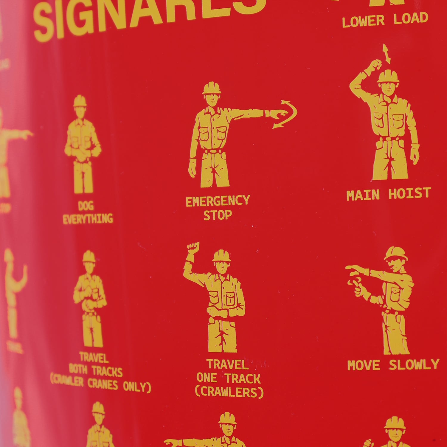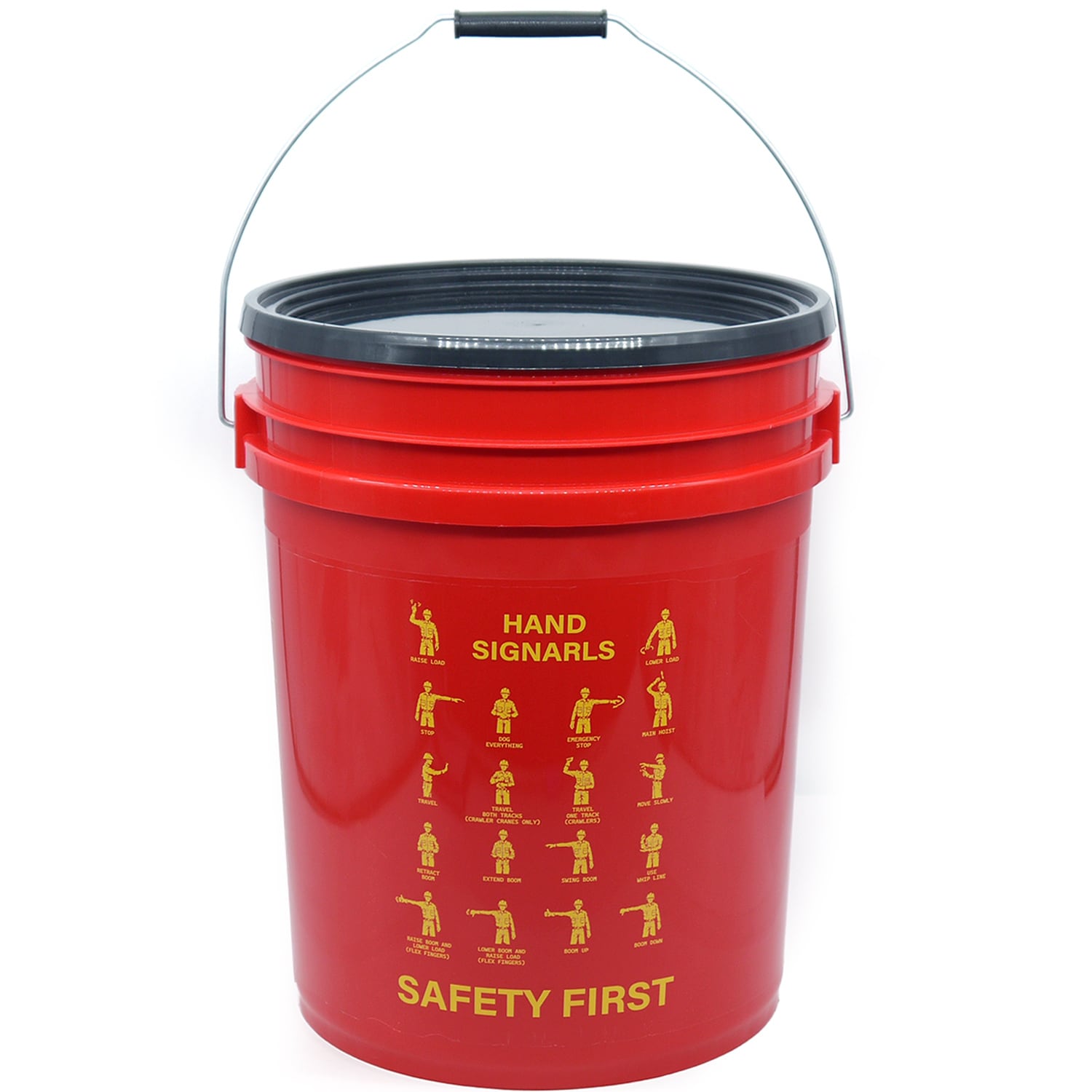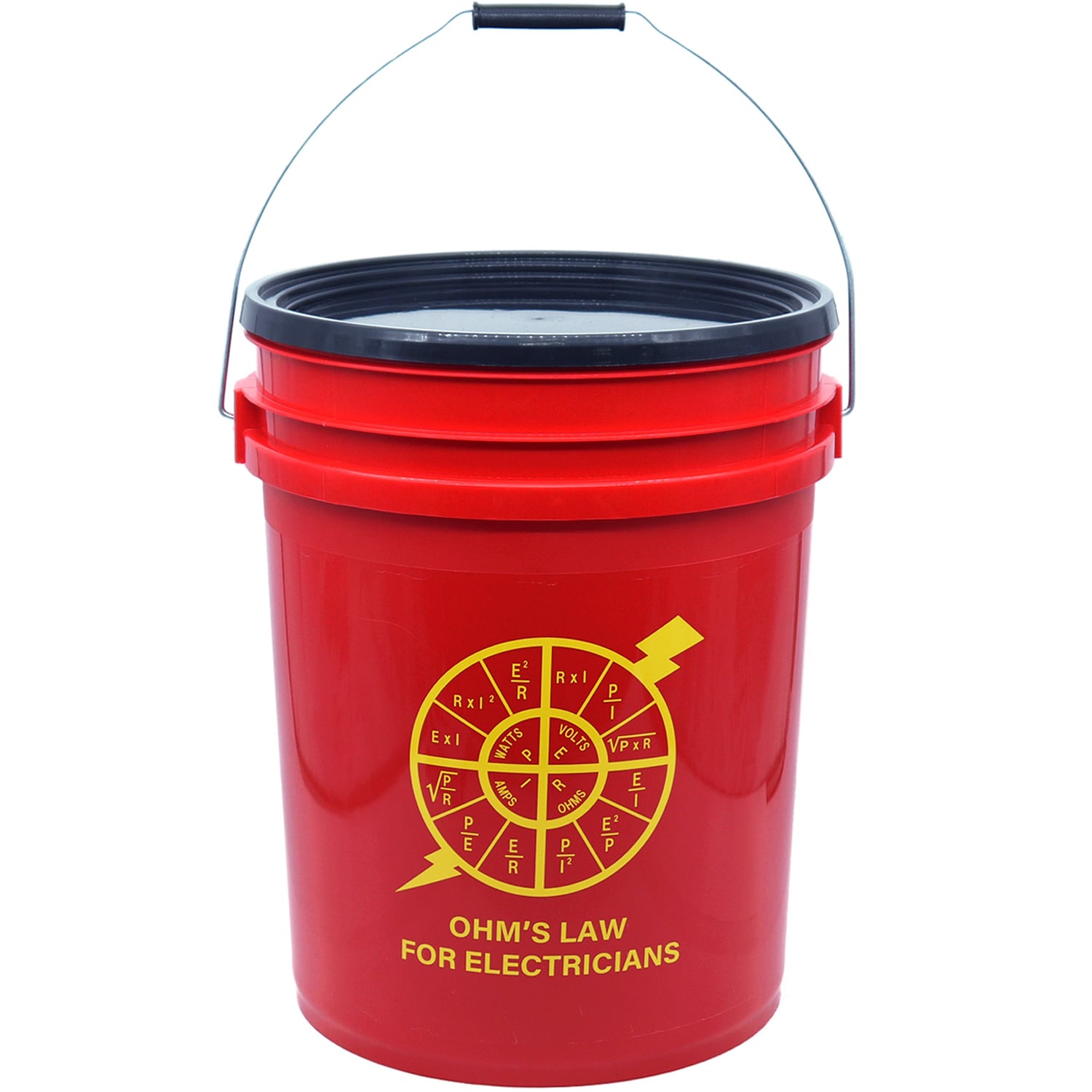 表にオームの法則円形チャート、裏に重機操作のハンドサインがプリントされたELECTRICIANSバケツ。